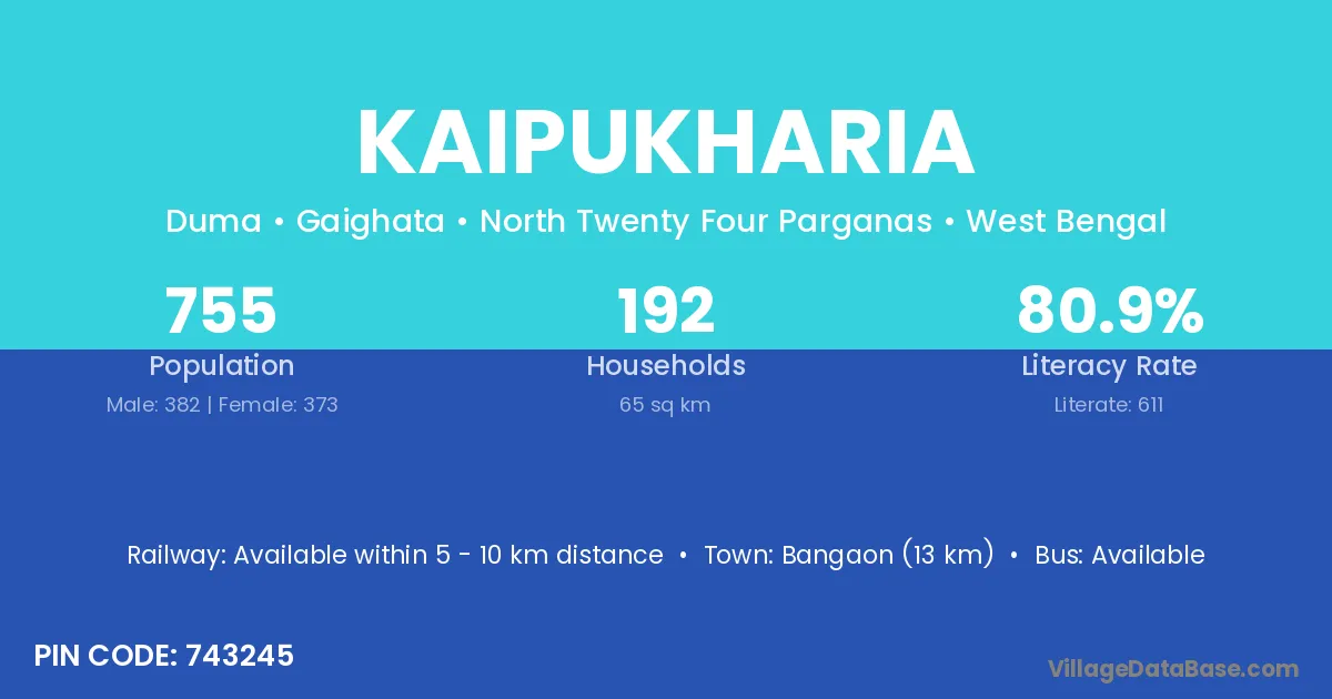 Bangaon (13 km) is the nearest town to Kaipukharia village for major economic activities and is located approximately 13 km away.
