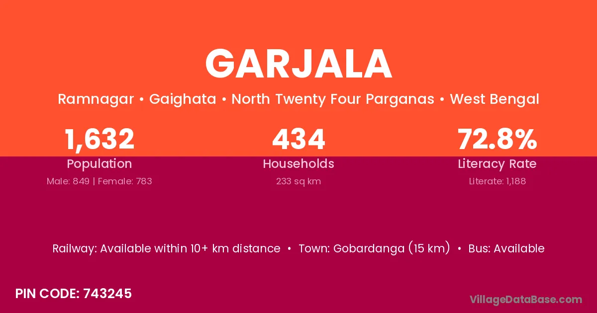 Gobardanga (15 km) is the nearest town to Garjala village for major economic activities and is located approximately 15 km away.