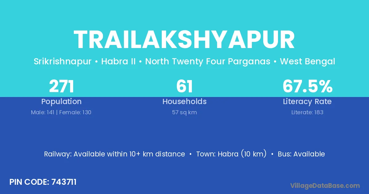 Trailakshyapur village has a total population of 271 people, of which 141 are males and 130 are females.