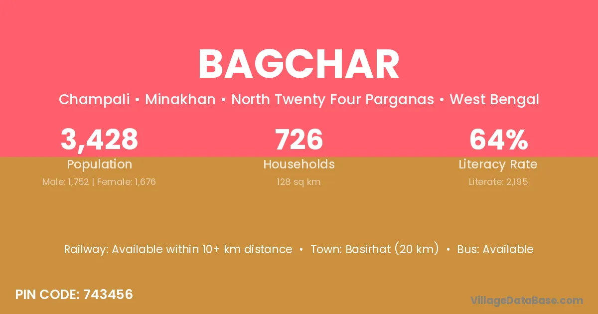 Bagchar village is located in the Minakhan Subdivision of the North Twenty Four Parganas district in West Bengal.