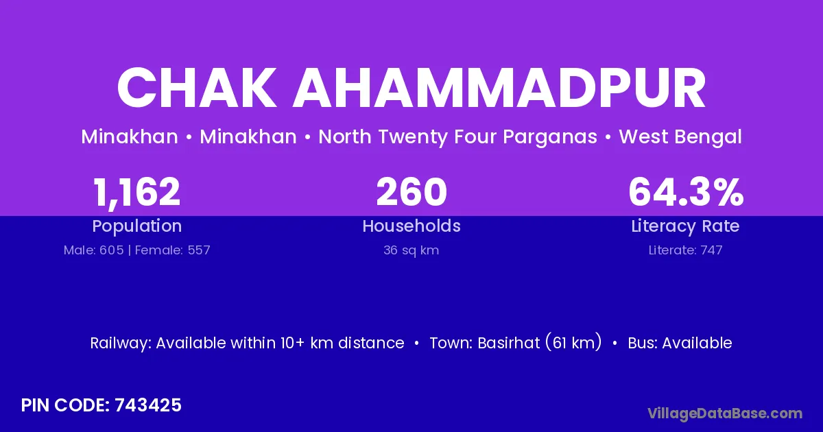 Basirhat (61 km) is the nearest town to Chak Ahammadpur village for major economic activities and is located approximately 61 km away.
