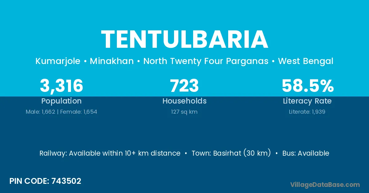 Basirhat (30 km) is the nearest town to Tentulbaria village for major economic activities and is located approximately 30 km away.