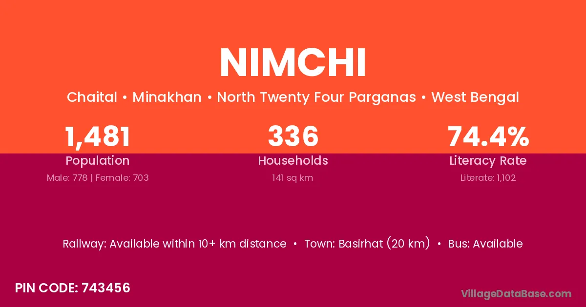 Basirhat (20 km) is the nearest town to Nimchi village for major economic activities and is located approximately 20 km away.