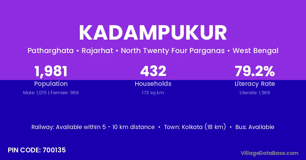 Kolkata (18 km) is the nearest town to Kadampukur village for major economic activities and is located approximately 18 km away.