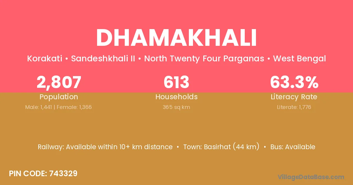 Basirhat (44 km) is the nearest town to Dhamakhali village for major economic activities and is located approximately 44 km away.