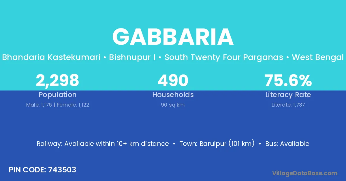 Basirhat (56 km) is the nearest town to Gabbaria village for major economic activities and is located approximately 56 km away.