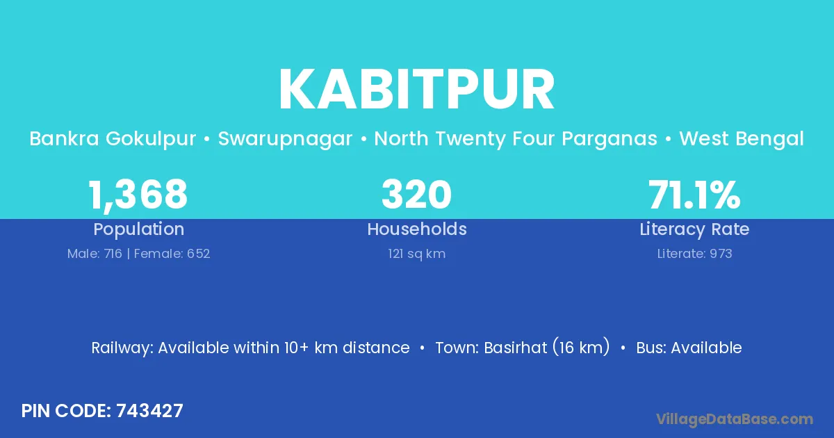 Basirhat (16 km) is the nearest town to Kabitpur village for major economic activities and is located approximately 16 km away.