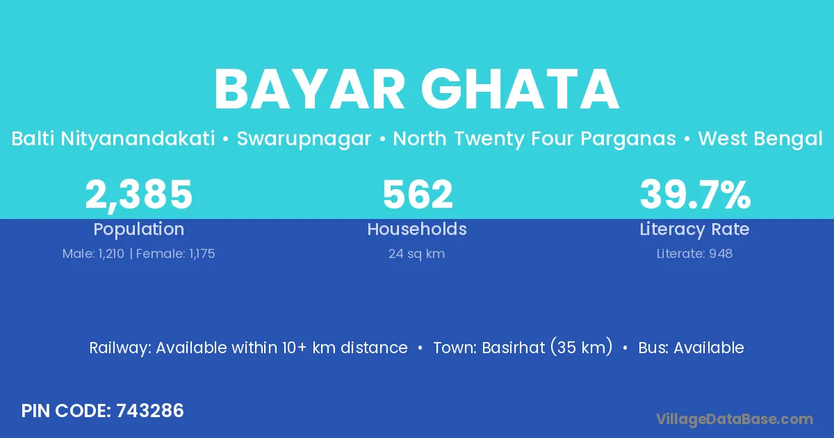 Basirhat (35 km) is the nearest town to Bayar Ghata village for major economic activities and is located approximately 35 km away.