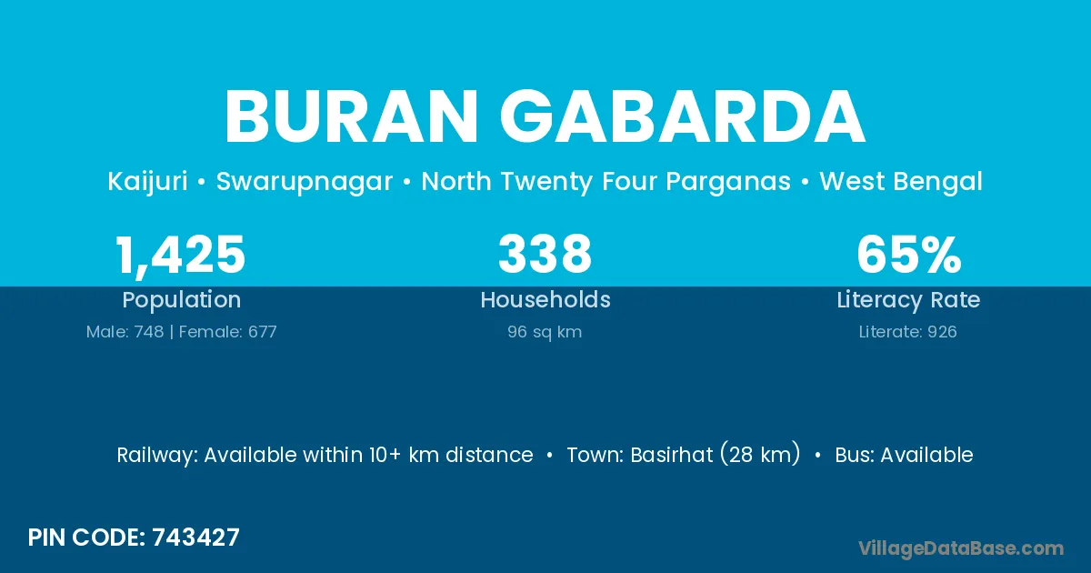 Basirhat (28 km) is the nearest town to Buran Gabarda village for major economic activities and is located approximately 28 km away.