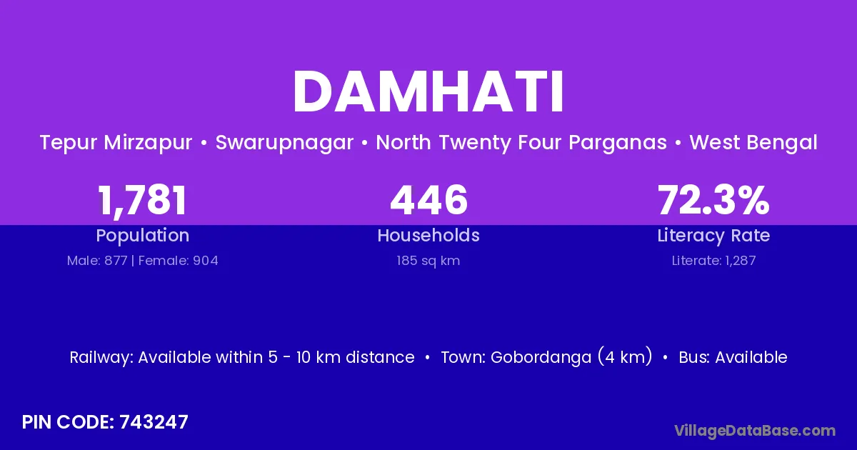 Gobordanga (4 km) is the nearest town to Damhati village for major economic activities and is located approximately 4 km away.