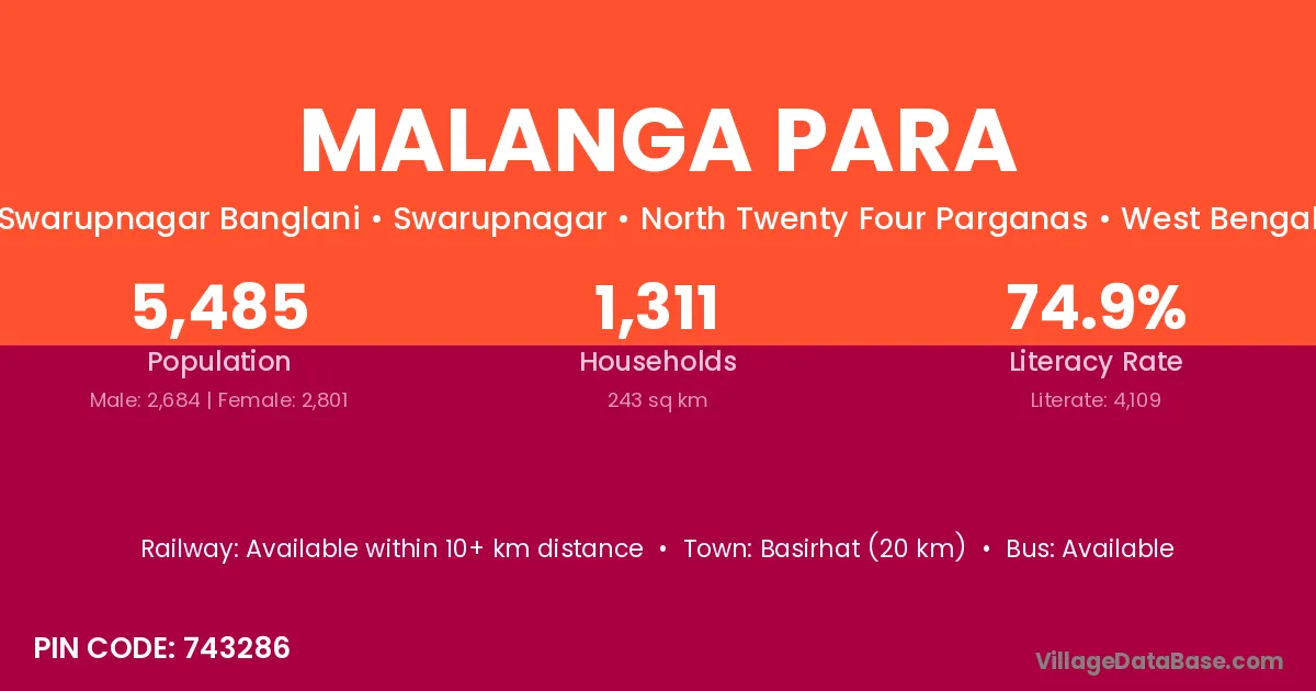 Basirhat (20 km) is the nearest town to Malanga Para village for major economic activities and is located approximately 20 km away.