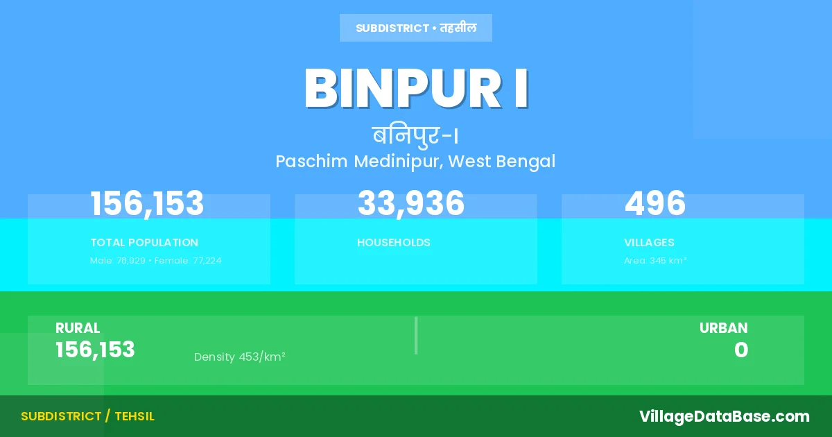 According to the 2011 census The total area of Binpur I Subdivision is 345 km², with a population of 156153 people. The population density is 453 inhabitants per square kilometre, and there are approximately 33936 houses in the sub district.