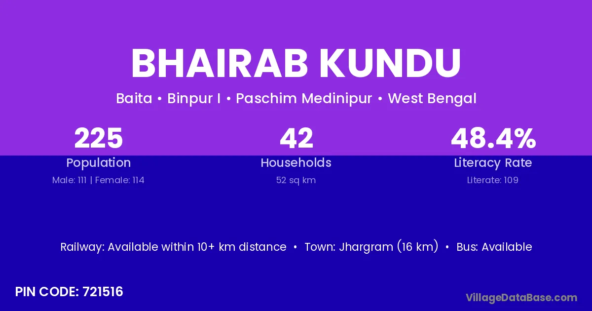 Jhargram (16 km) is the nearest town to Bhairab Kundu village for major economic activities and is located approximately 16 km away.