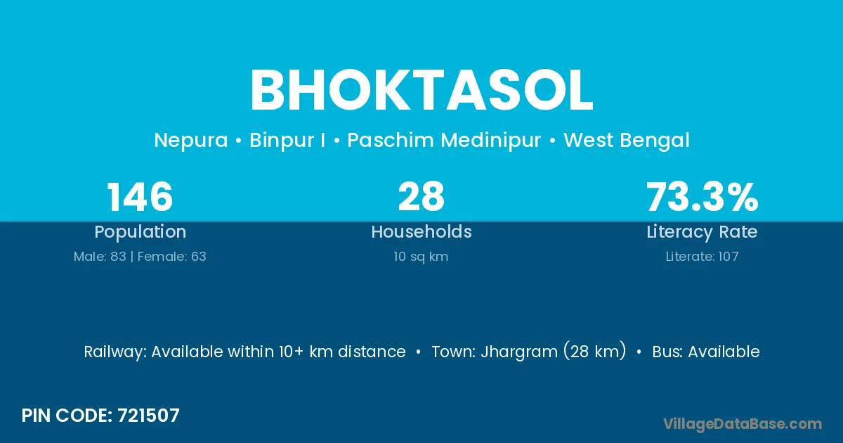 Jhargram (28 km) is the nearest town to Bhoktasol village for major economic activities and is located approximately 28 km away.