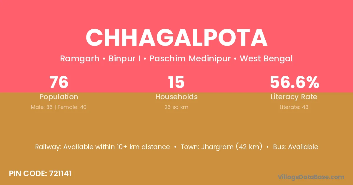 Jhargram (42 km) is the nearest town to Chhagalpota village for major economic activities and is located approximately 42 km away.