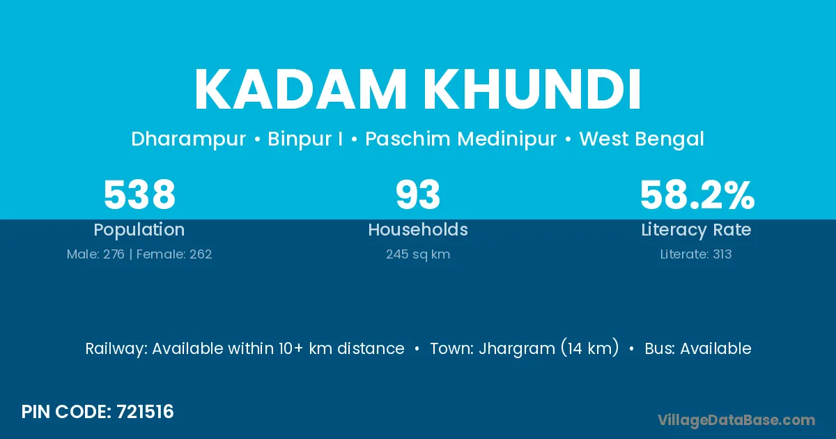 Jhargram (14 km) is the nearest town to Kadam Khundi village for major economic activities and is located approximately 14 km away.