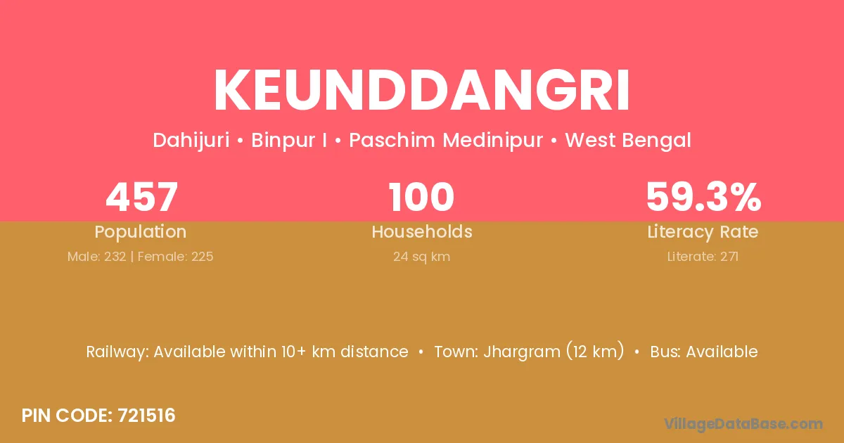 Jhargram (12 km) is the nearest town to Keunddangri village for major economic activities and is located approximately 12 km away.