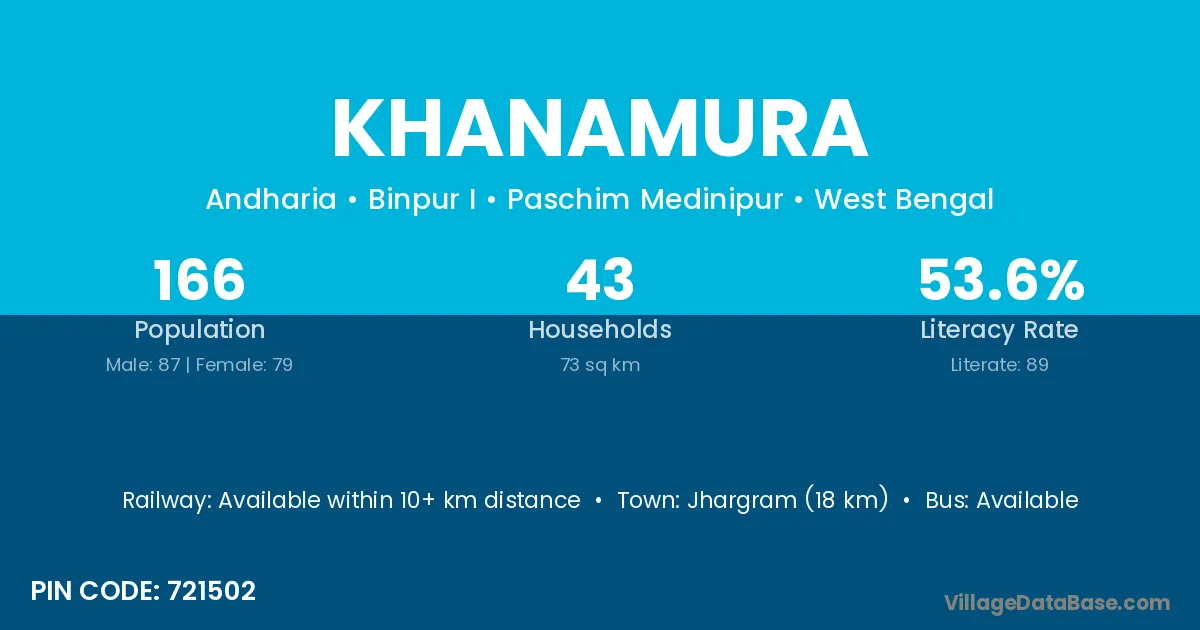 Jhargram (18 km) is the nearest town to Khanamura village for major economic activities and is located approximately 18 km away.