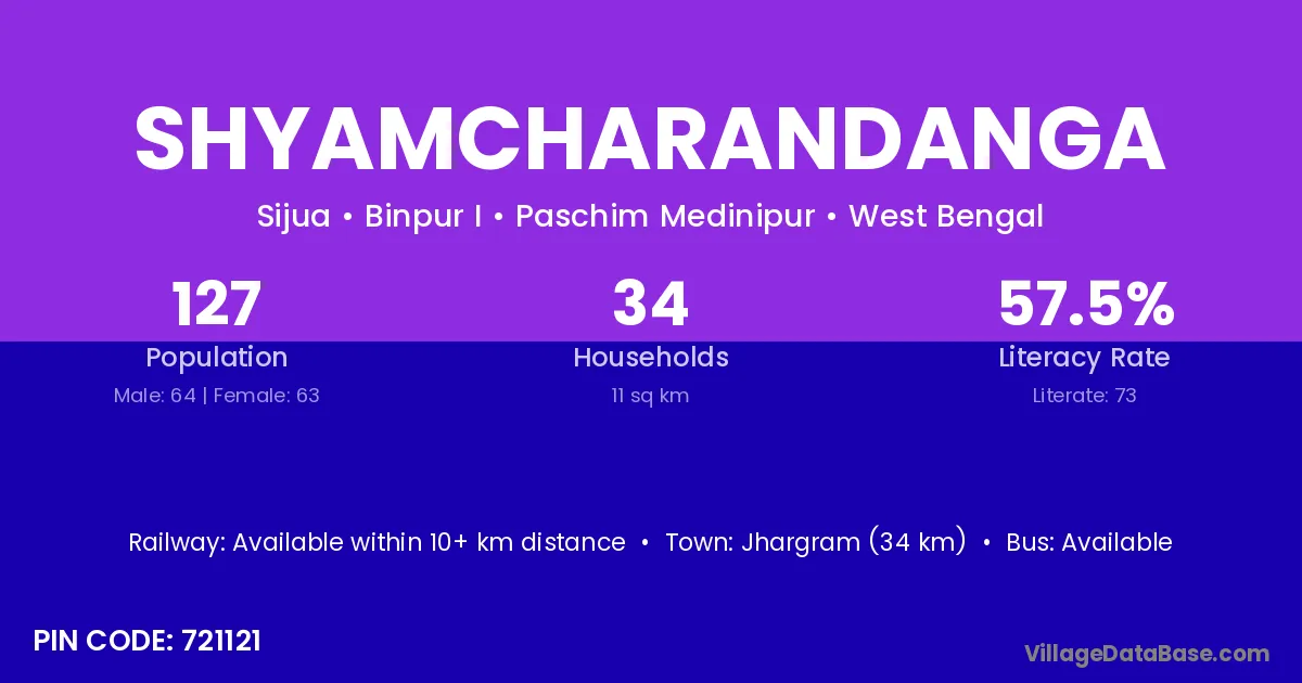 Jhargram (34 km) is the nearest town to Shyamcharandanga village for major economic activities and is located approximately 34 km away.