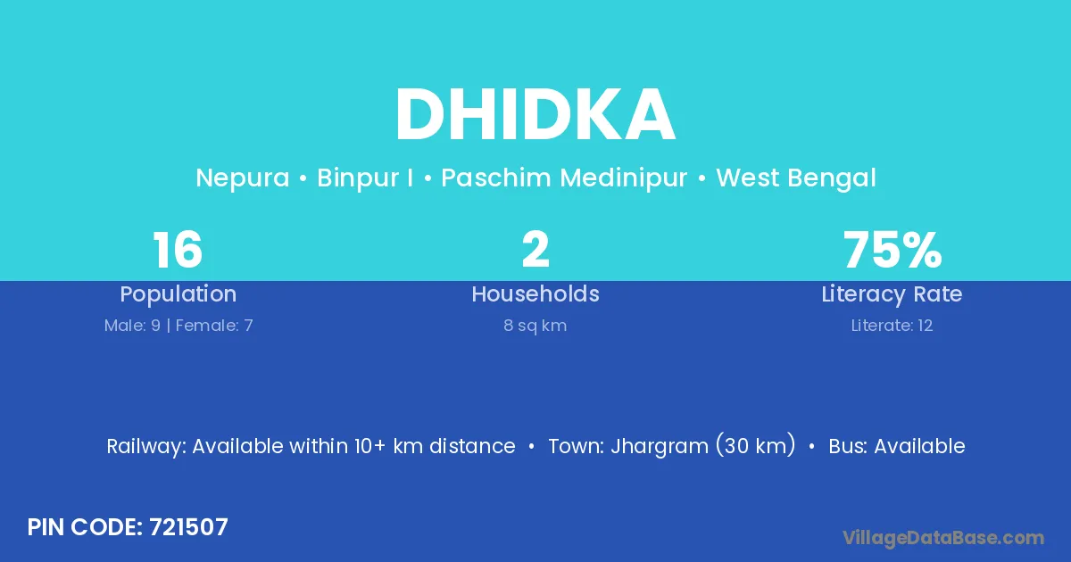Jhargram (30 km) is the nearest town to Dhidka village for major economic activities and is located approximately 30 km away.