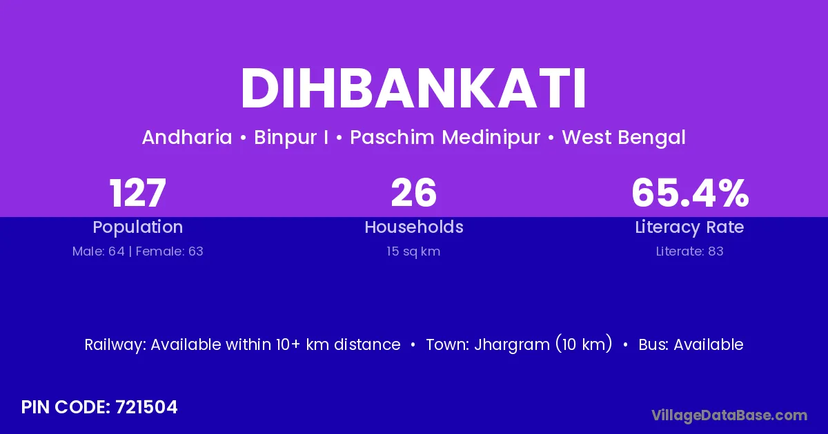 Jhargram (10 km) is the nearest town to Dihbankati village for major economic activities and is located approximately 10 km away.