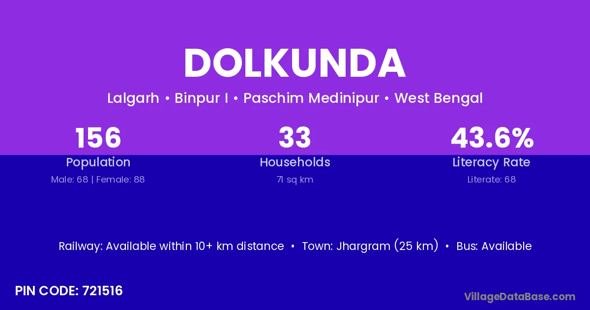 Jhargram (25 km) is the nearest town to Dolkunda village for major economic activities and is located approximately 25 km away.