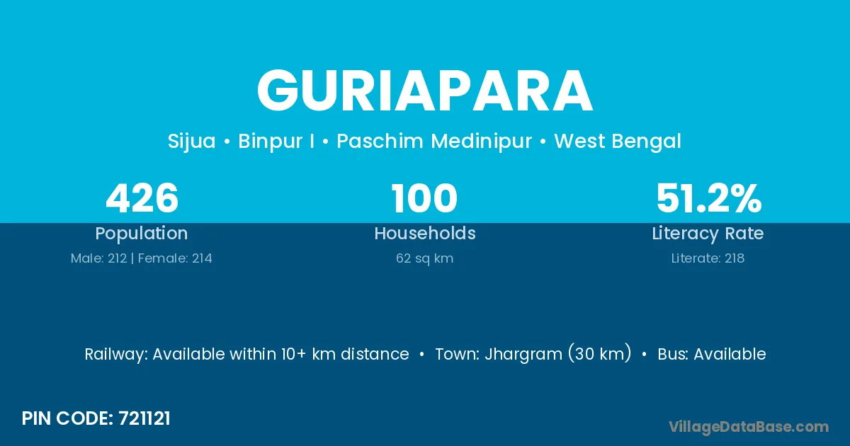 Jhargram (30 km) is the nearest town to Guriapara village for major economic activities and is located approximately 30 km away.
