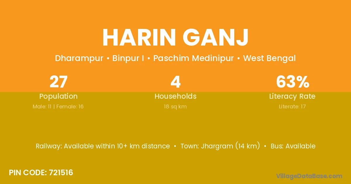 Jhargram (14 km) is the nearest town to Harin Ganj village for major economic activities and is located approximately 14 km away.