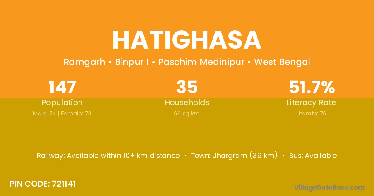 Jhargram (39 km) is the nearest town to Hatighasa village for major economic activities and is located approximately 39 km away.