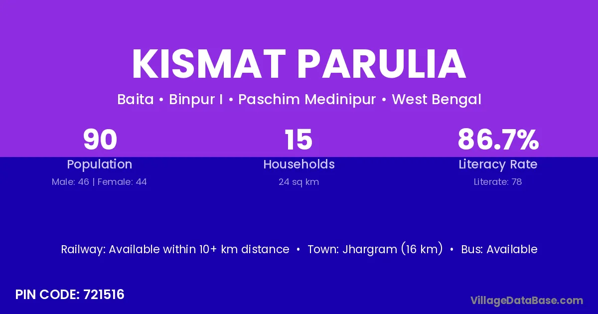 Jhargram (16 km) is the nearest town to Kismat Parulia village for major economic activities and is located approximately 16 km away.