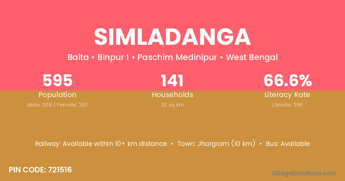 Jhargram (10 km) is the nearest town to Simladanga village for major economic activities and is located approximately 10 km away.