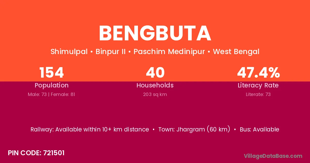 Jhargram (60 km) is the nearest town to Bengbuta village for major economic activities and is located approximately 60 km away.