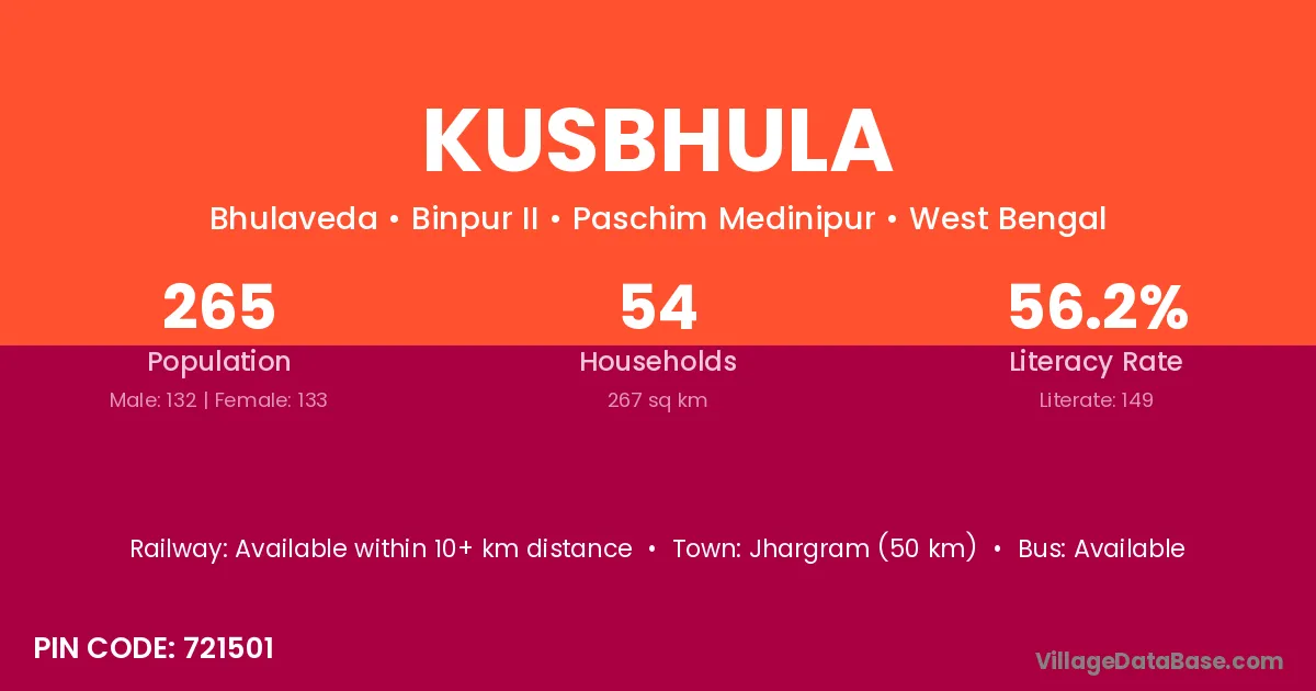Jhargram (50 km) is the nearest town to Kusbhula village for major economic activities and is located approximately 50 km away.