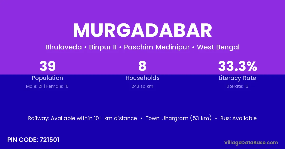 Jhargram (53 km) is the nearest town to Murgadabar village for major economic activities and is located approximately 53 km away.