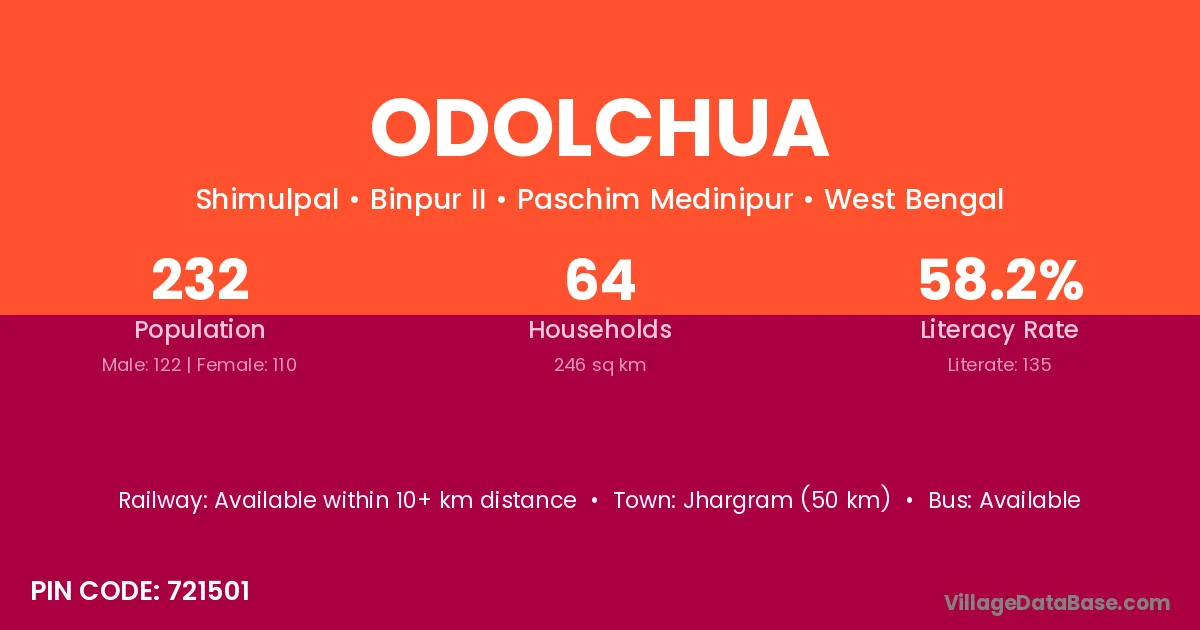 Jhargram (50 km) is the nearest town to Odolchua village for major economic activities and is located approximately 50 km away.