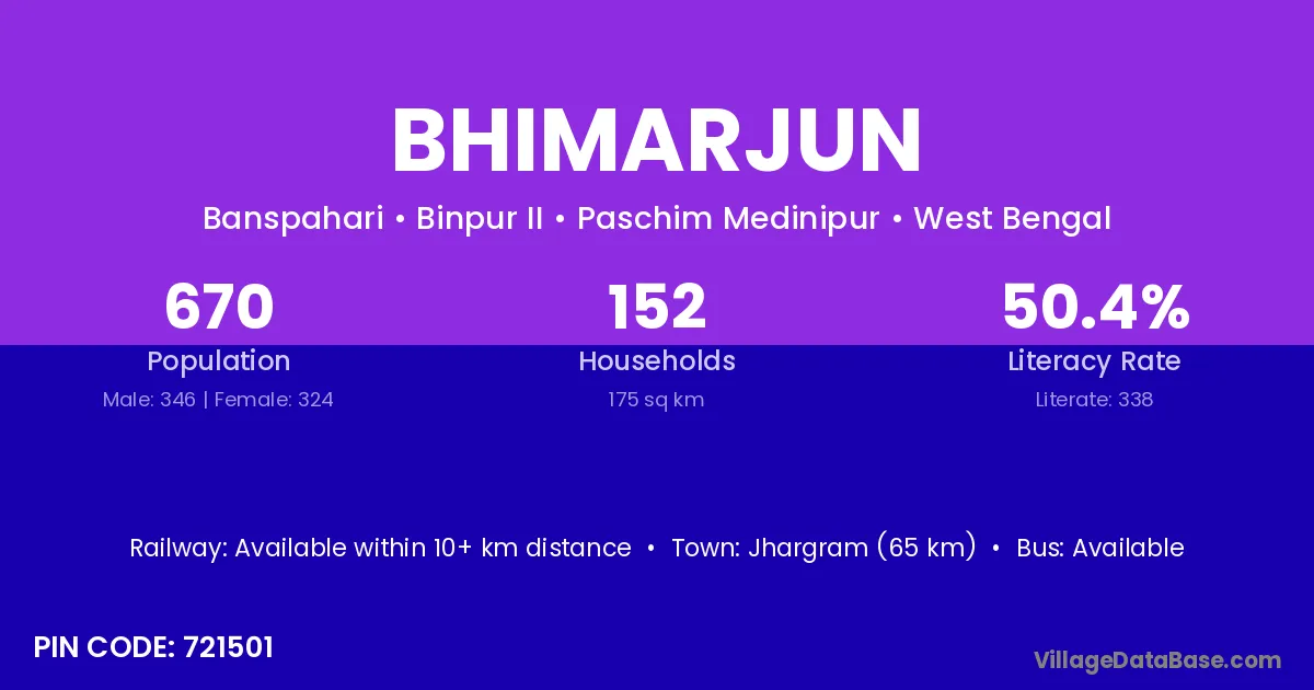 Jhargram (65 km) is the nearest town to Bhimarjun village for major economic activities and is located approximately 65 km away.