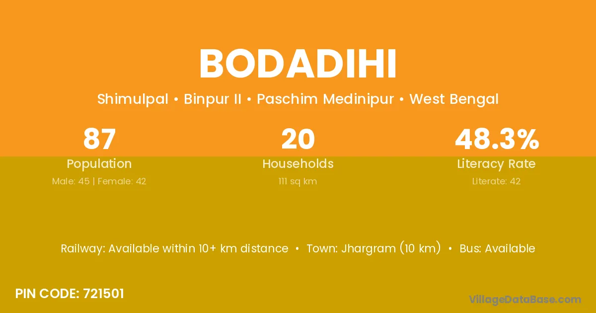 Jhargram (10 km) is the nearest town to Bodadihi village for major economic activities and is located approximately 10 km away.