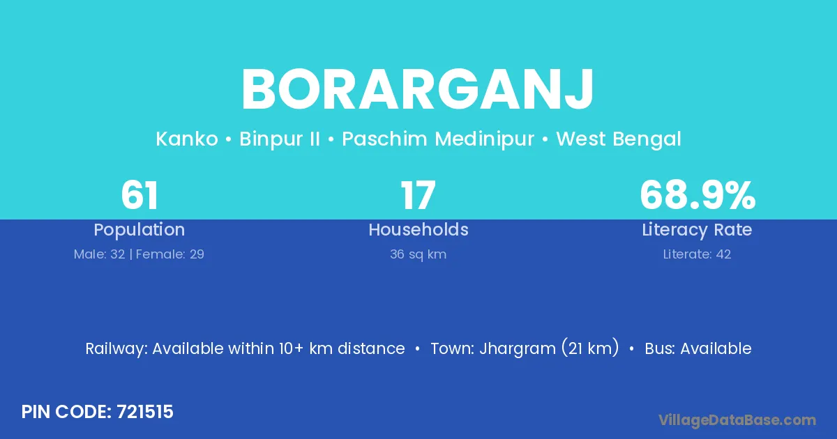 Jhargram (21 km) is the nearest town to Borarganj village for major economic activities and is located approximately 21 km away.