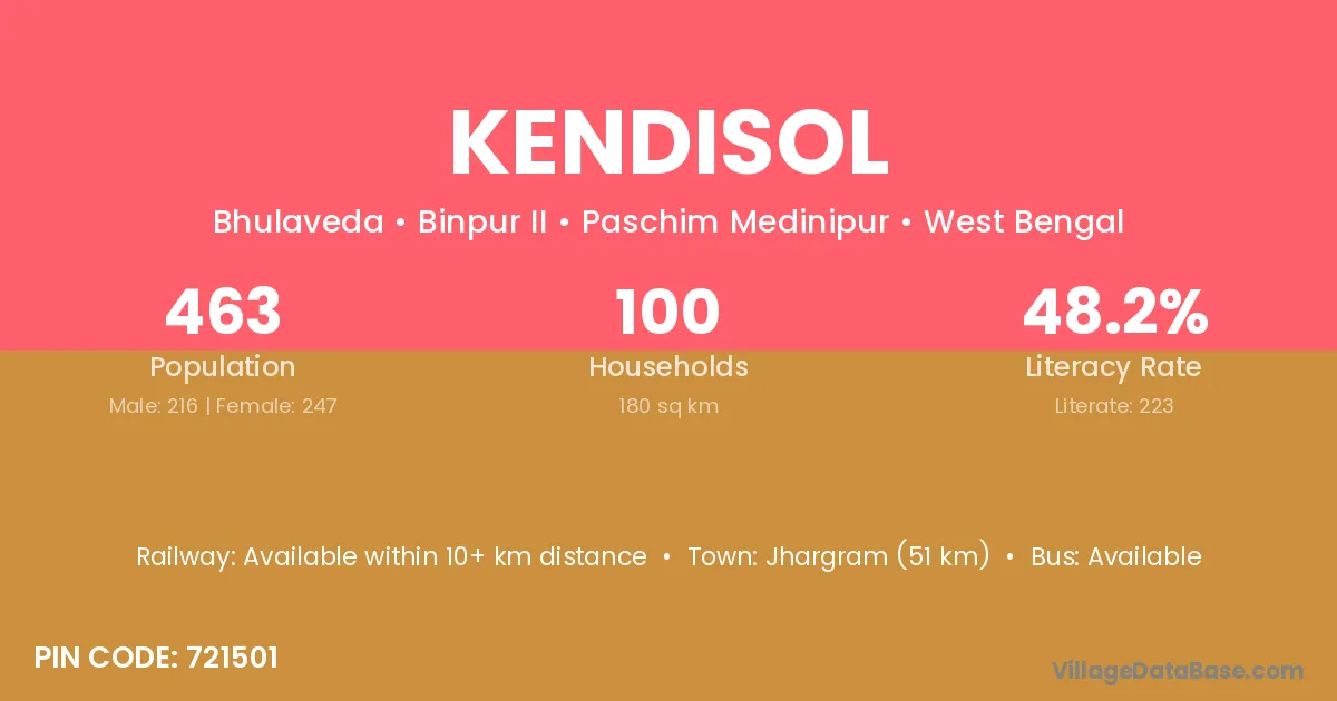 Jhargram (51 km) is the nearest town to Kendisol village for major economic activities and is located approximately 51 km away.