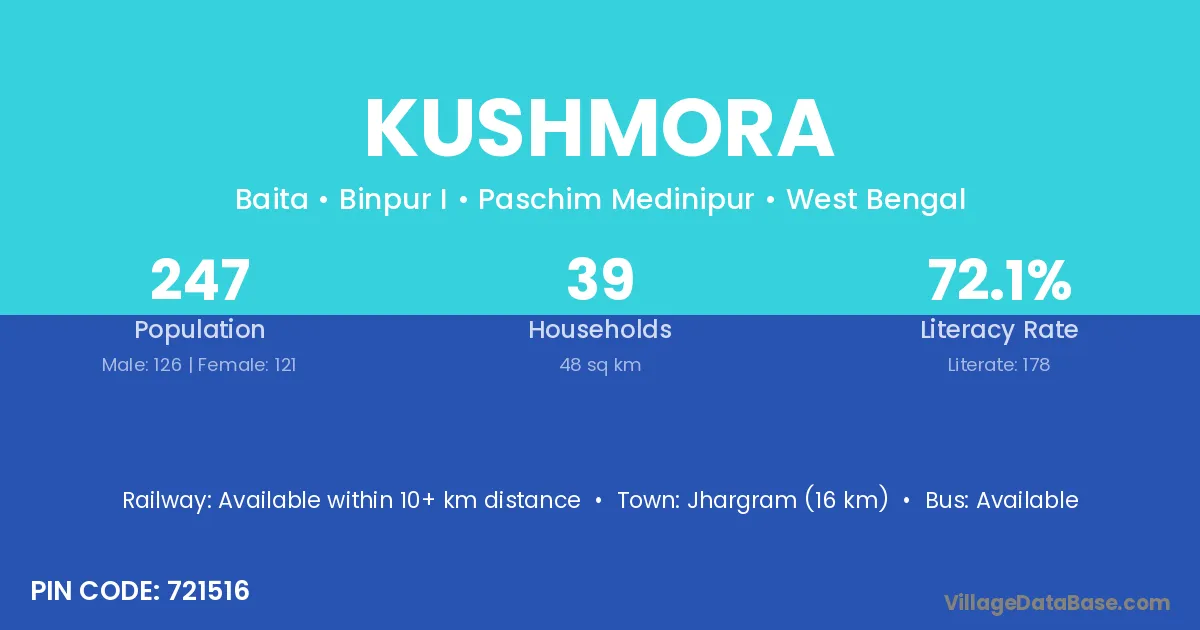 Jhargram (35 km) is the nearest town to Kushmora village for major economic activities and is located approximately 35 km away.