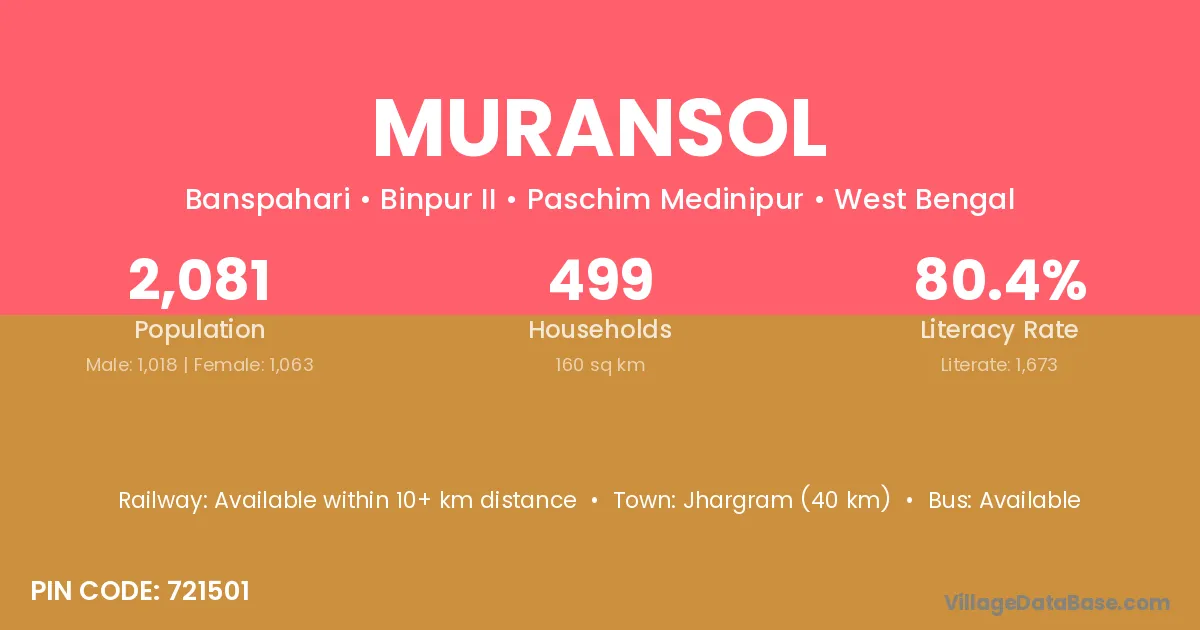 Jhargram (40 km) is the nearest town to Muransol village for major economic activities and is located approximately 40 km away.