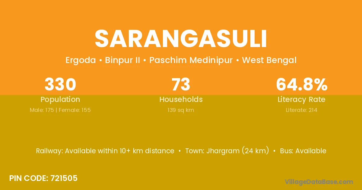 Jhargram (24 km) is the nearest town to Sarangasuli village for major economic activities and is located approximately 24 km away.