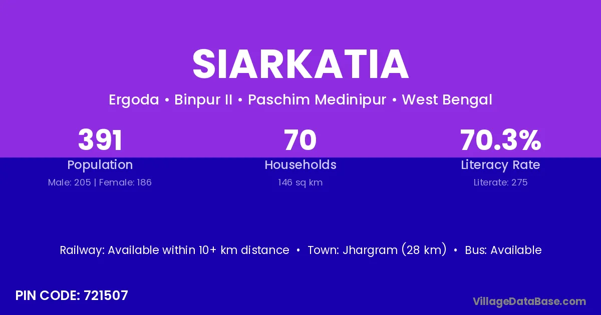Jhargram (28 km) is the nearest town to Siarkatia village for major economic activities and is located approximately 28 km away.