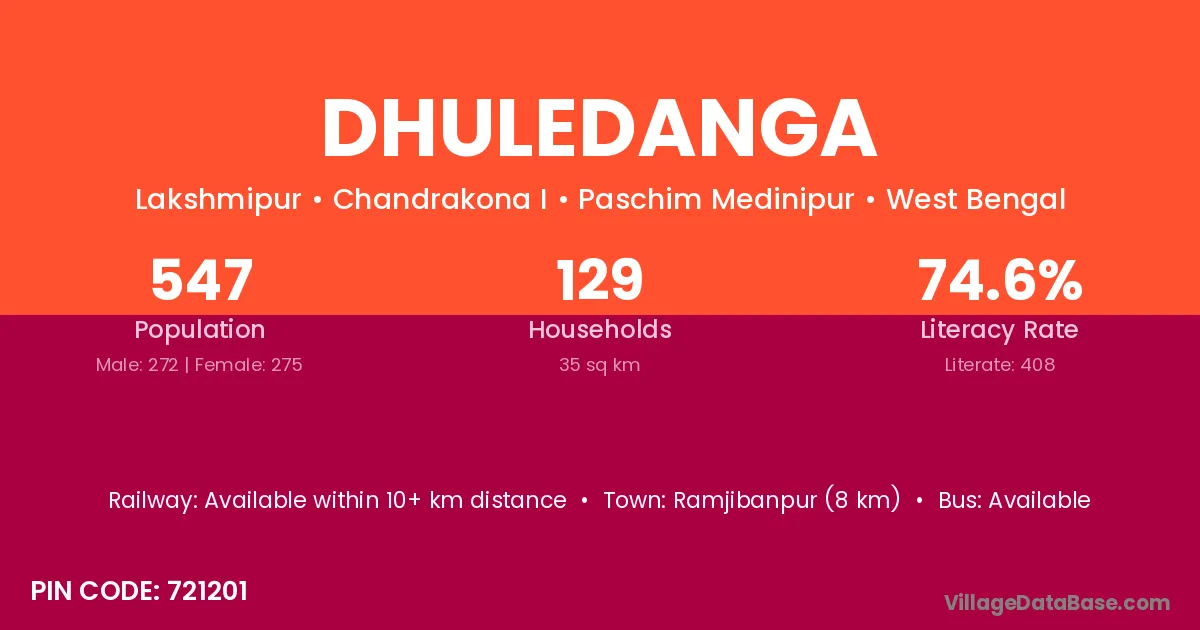 Ramjibanpur (8 km) is the nearest town to Dhuledanga village for major economic activities and is located approximately 8 km away.