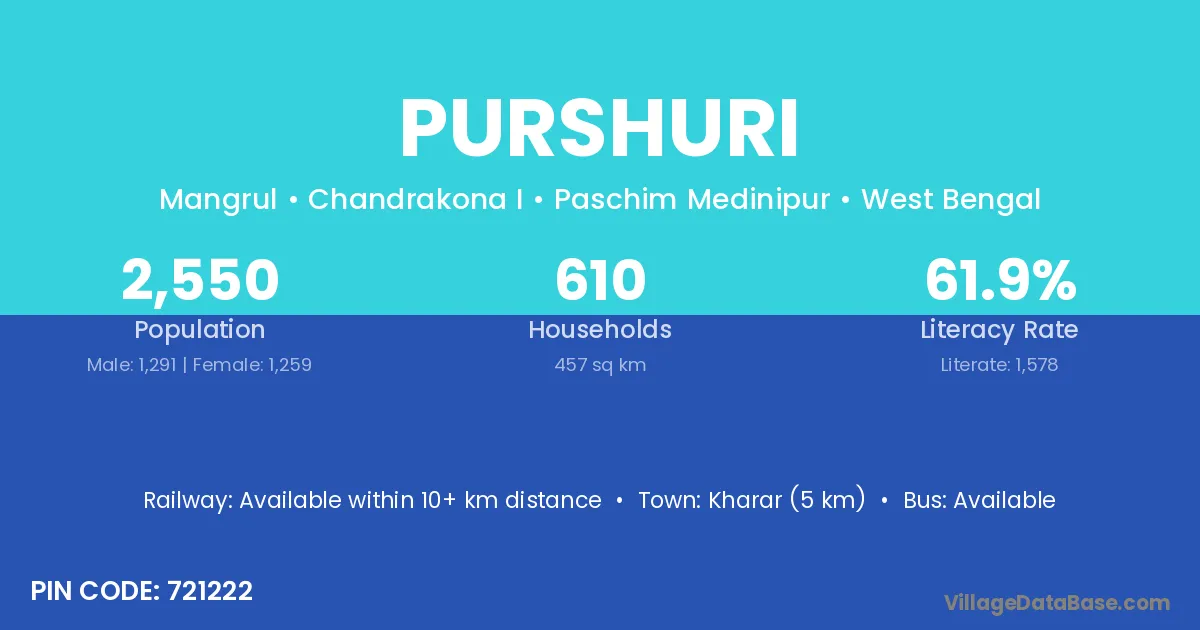 Kharar (5 km) is the nearest town to Purshuri village for major economic activities and is located approximately 5 km away.