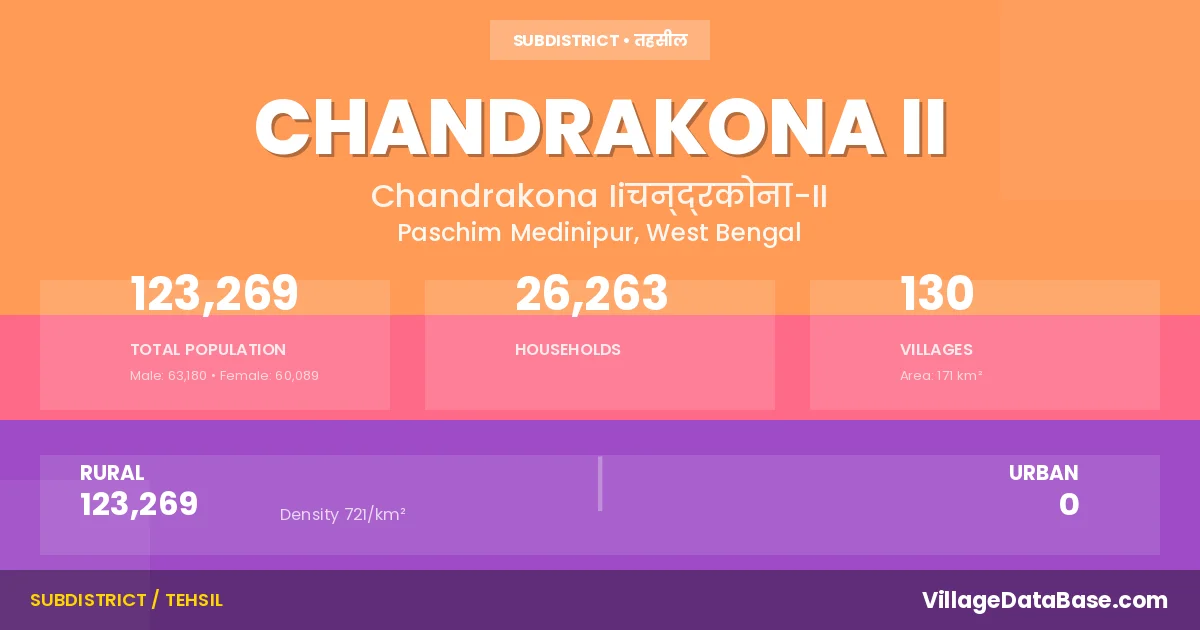 According to the 2011 census The total area of Chandrakona II Subdivision is 171 km², with a population of 123269 people. The population density is 721 inhabitants per square kilometre, and there are approximately 26263 houses in the sub district.