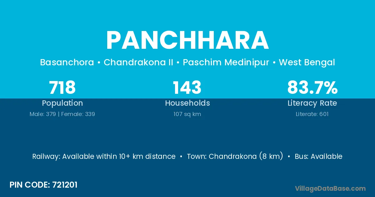 Chandrakona (8 km) is the nearest town to Panchhara village for major economic activities and is located approximately 8 km away.