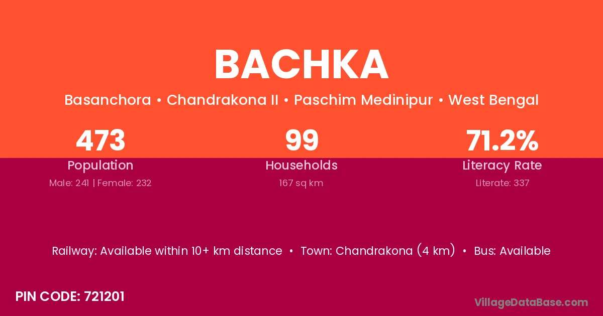 Chandrakona (4 km) is the nearest town to Bachka village for major economic activities and is located approximately 4 km away.