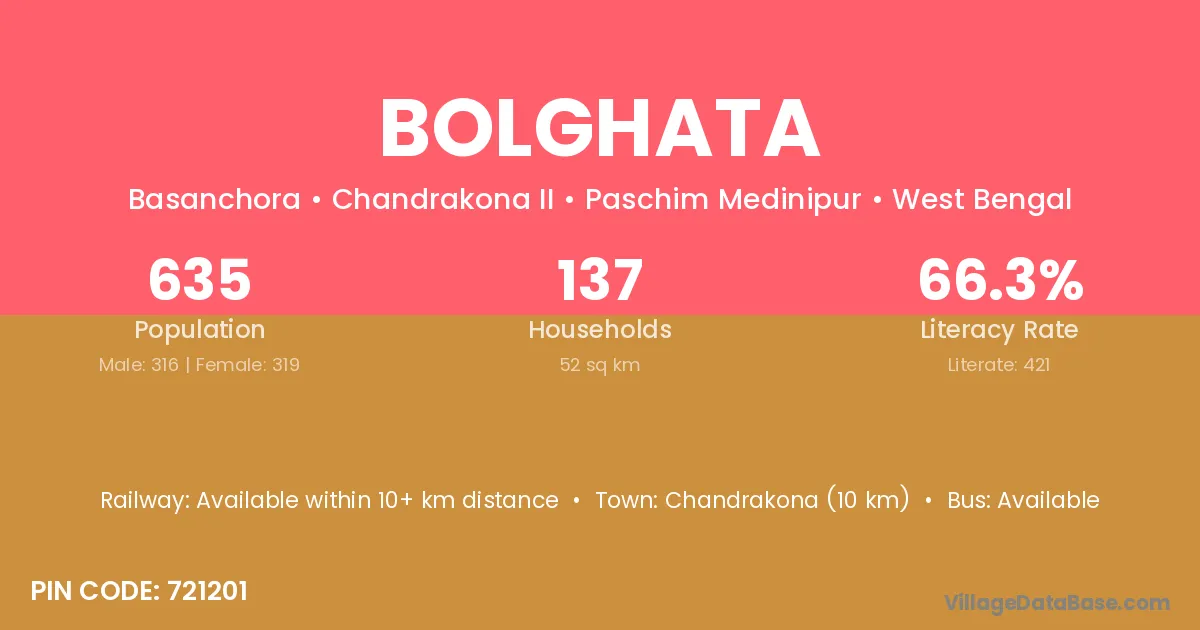 Bolghata village has a total population of 635 people, of which 316 are males and 319 are females.