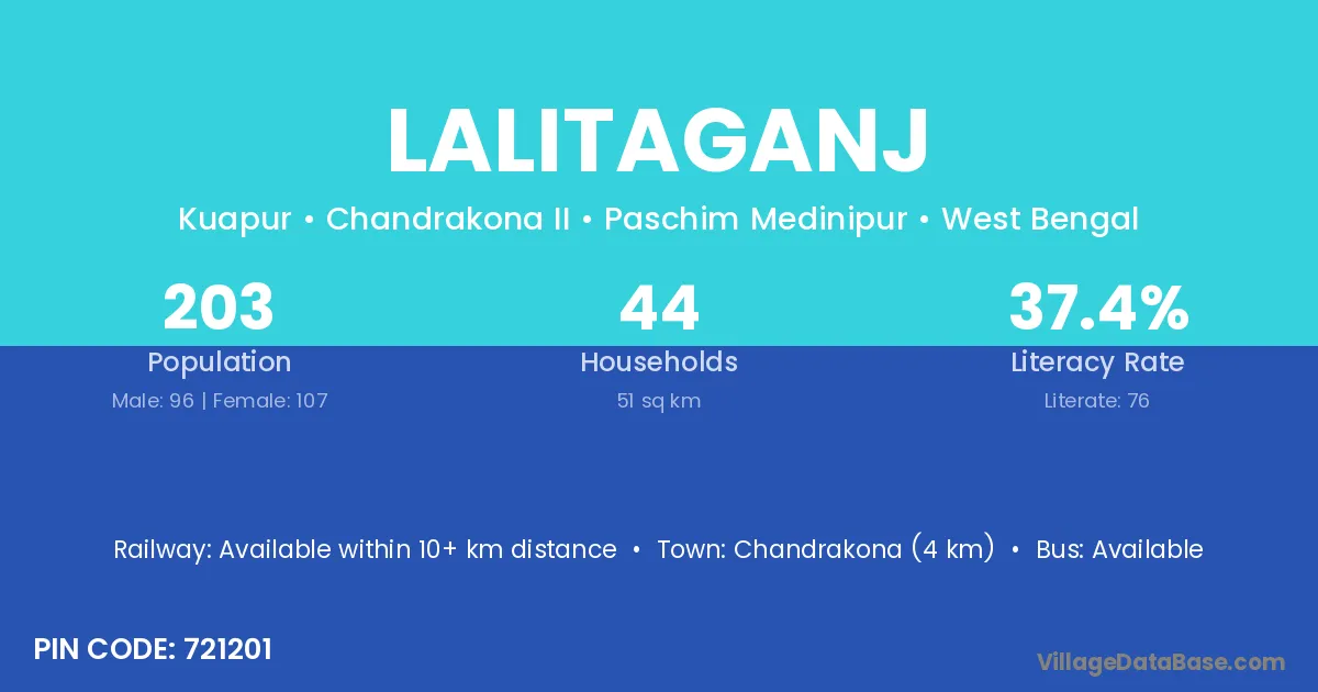 Chandrakona (4 km) is the nearest town to Lalitaganj village for major economic activities and is located approximately 4 km away.